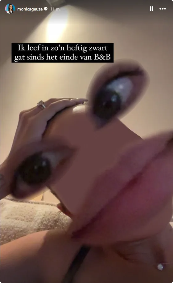 Monica is groot fan van B&B Vol Liefde en dat is nu ten einde gekomen. Alhoewel de reünie bijna te zien is (zie video), weet de presentatrice zich even geen raad meer zonder haar favoriete programma. "Ik leef in zo'n heftig zwart gat sinds het einde van B&B", schrijft ze op haar Stories.