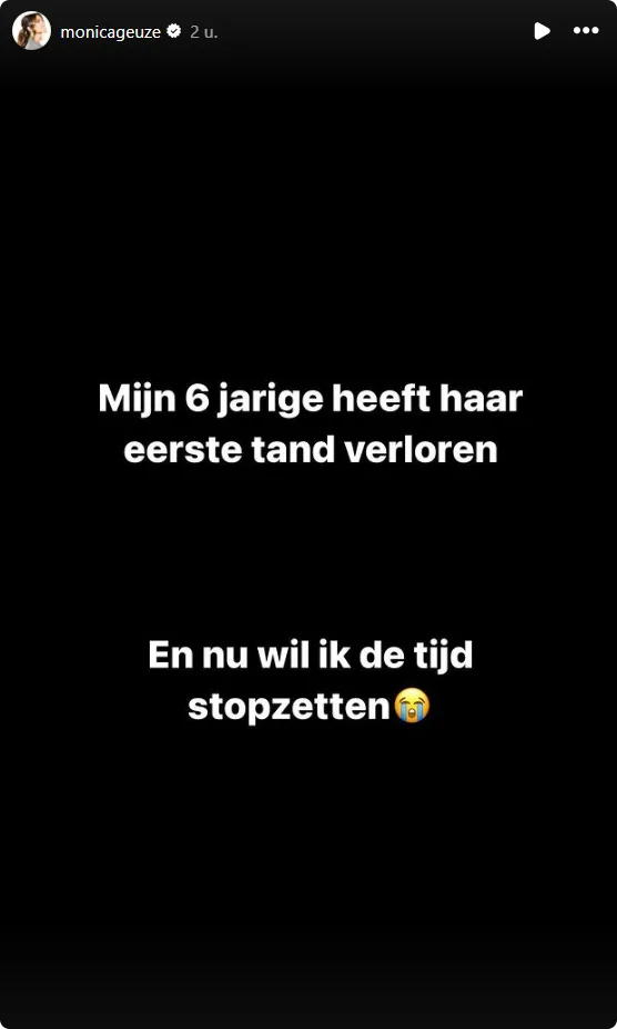 "Mijn 6-jarige heeft haar eerste tand verloren", zo schrijft Monica in haar Instagram Stories. Ze vervolgt met: "Nu wil de tijd stopzetten." Ze heeft er een huilende emoji bij geplaatst, waarmee duidelijk maakt dit een emotioneel moment te vinden.