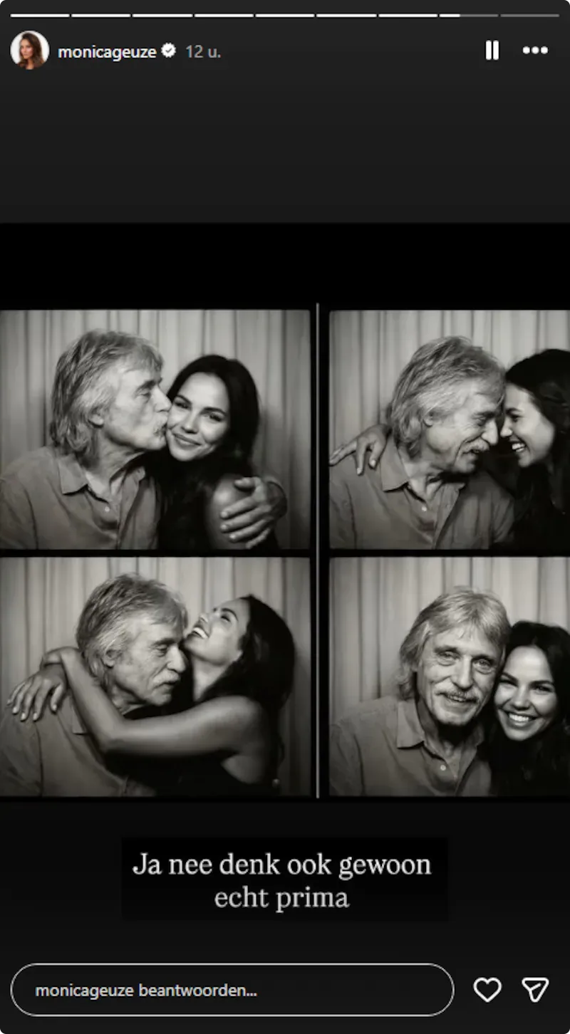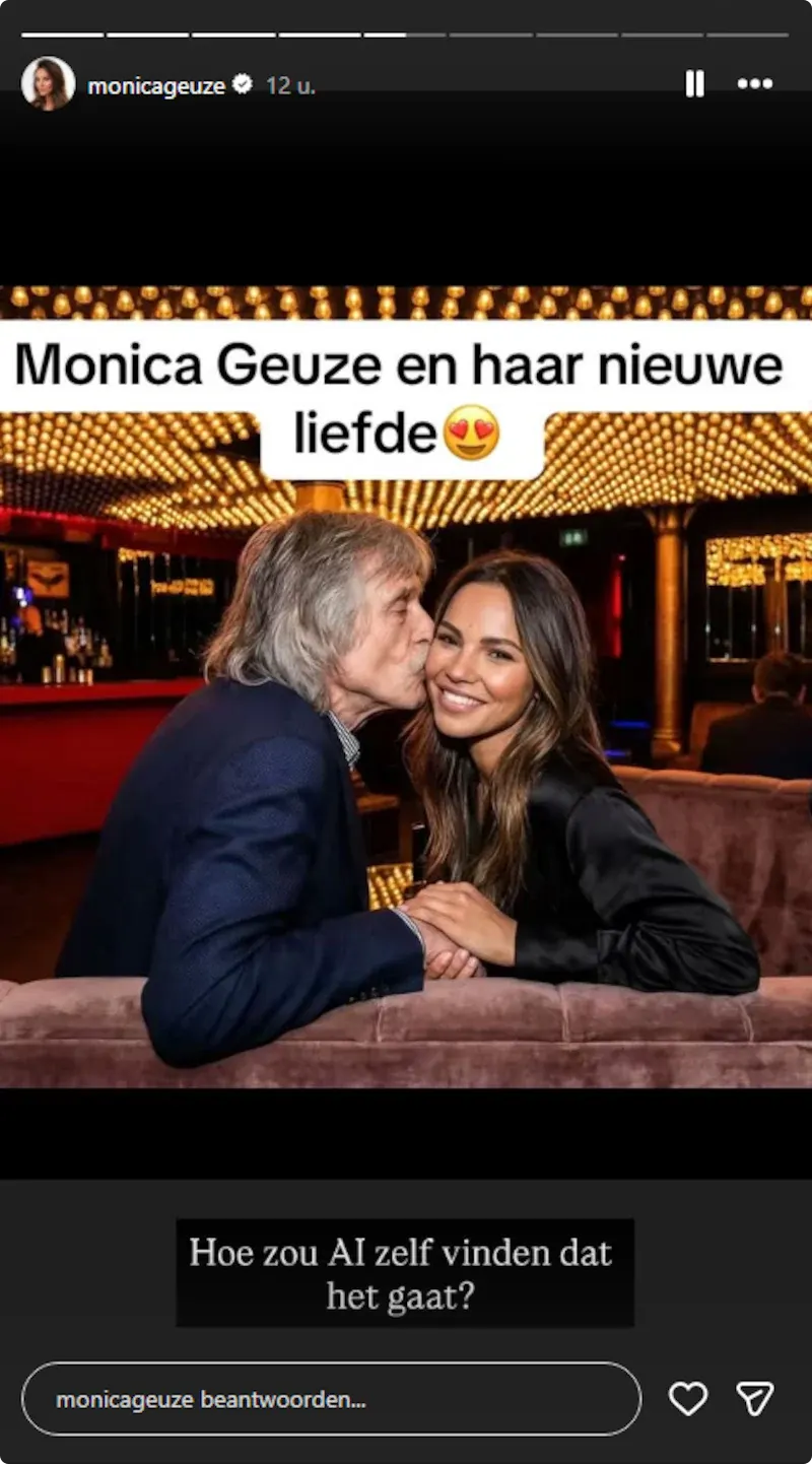 Via haar Stories deelt Monica een reeks foto's met de Vandaag Inside-snor. Zo is te zien hoe de twee lachend een frietje delen, proosten met hun matcha's, innig poseren in een photobooth en op een foto legt Johan zelfs zijn handen op Monica's zwangere buik. Natuurlijk is het een grapje, want de foto’s zijn AI-gegenereerd.