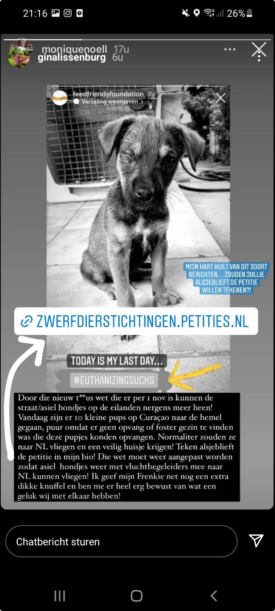 "Normaliter zouden ze naar Nederland vliegen en een veilig huisje krijgen!" vervolgt ze. "Teken alsjeblieft de petitie in mijn bio! Die wet moet weer aangepast worden, zodat asielhondjes weer met vluchtbegeleiders mee naar Nederland kunnen vliegen!"