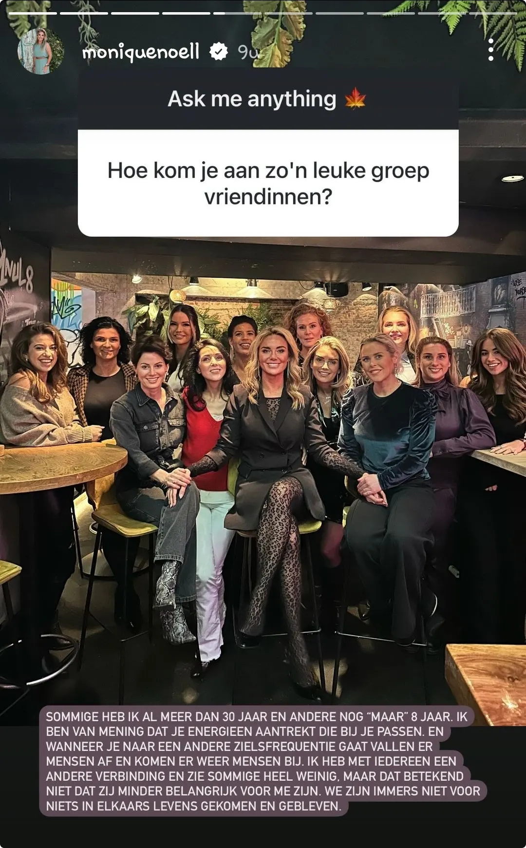 Monique verbaast zich over de moeders die deze denkwijze hebben: "Als ik kijk naar mijn vriendinnen, of mijn zus, of mijn buren bijvoorbeeld. Die gaan elk jaar met vriendinnen weg. Dat is toch héérlijk? Dat moet je elkaar gunnen", zegt ze. Donderdag deelt Monique dan ook een lieve foto in haar Story met een stoet aan vriendinnen om zich heen (zie onderstaande foto).