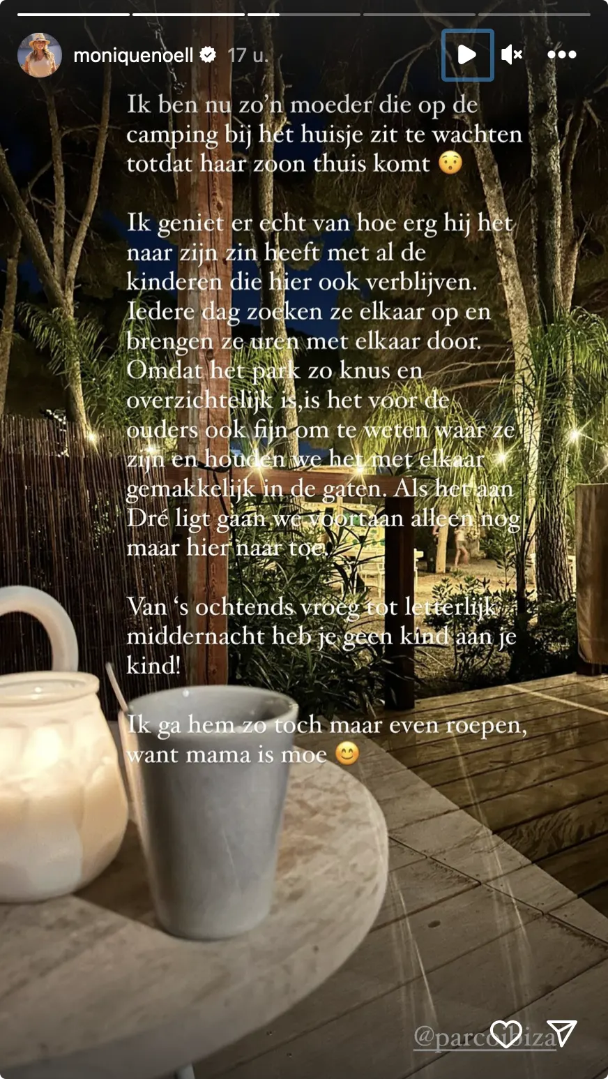 "Ik ben nu zo’n moeder die op de camping bij het huisje zit te wachten totdat haar zoon thuiskomt. Ik geniet er echt van hoe erg hij het naar zijn zin heeft met alle kinderen die hier ook verblijven. Iedere dag zoeken ze elkaar op en brengen ze uren met elkaar door." Toch houdt Monique haar zoon goed in de gaten. "Omdat het park zo knus en overzichtelijk is, is het voor de ouders ook fijn om te weten waar ze zijn en houden we het met elkaar gemakkelijk in de gaten."