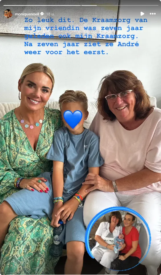 Maar dat is niet het enige bijzondere aan haar post. Monique deelt ook een hartverwarmende foto van haar zoon André samen met de kraamverzorgster van haar vriendin. "Zo leuk dit. De kraamzorg van mijn vriendin was zeven jaar geleden ook mijn kraamzorg. Na zeven jaar ziet ze André weer voor het eerst," schrijft ze erbij.