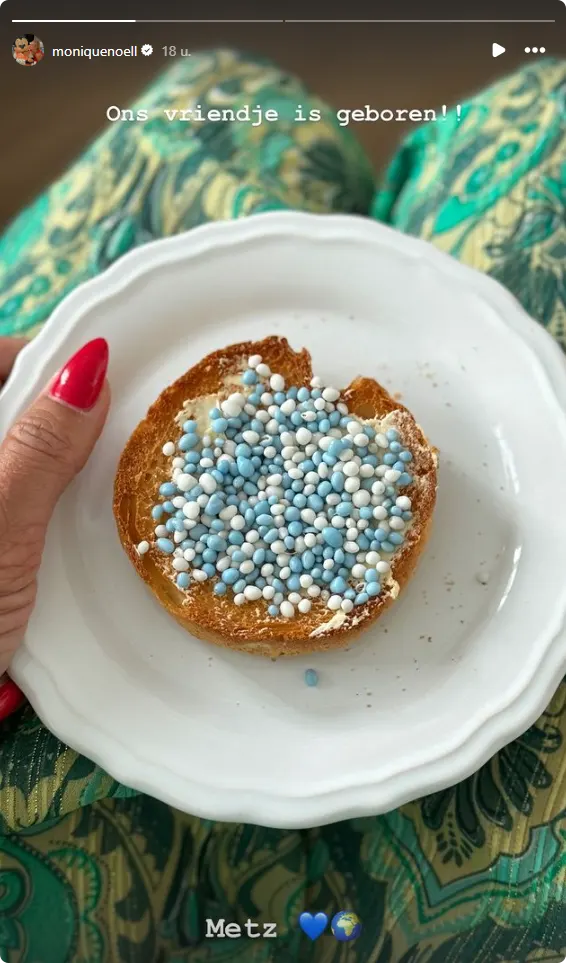 Monique Westenberg heeft op Instagram het prachtige nieuws gedeeld dat haar vriendin is bevallen van een jongen. Ze plaatst een foto van een beschuitje met blauwe muisjes en schrijft erbij: "Ons vriendje is geboren!! Metz."