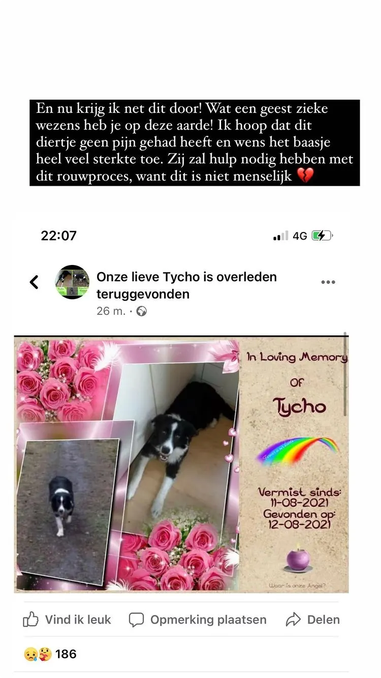 Kort daarna plaatst Monique een bericht waaruit blijkt dat de ontvoerde hond overleden is teruggevonden. "En nu krijg ik dit door! Wat een geestzieke wezens heb je op deze aarde!", schrijft Monique bij het bericht. "Ik hoop dat dit diertje geen pijn heeft gehad en wens het baasje heel veel sterkte toe. Zij zal hulp nodig hebben met dit rouwproces, want dit is niet menselijk."