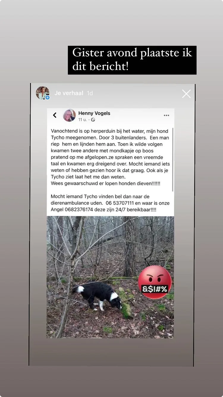 De ex-verloofde van André Hazes deelt een screenshot van een bericht over een vermiste hond. De hond zou in het bos zijn meegenomen, en de eigenares van de hond werd naar eigen zeggen bedreigd. "Gisteravond plaatste ik dit bericht", schrijft Monique bij de oproep van de vrouw die haar vermiste hond zocht.