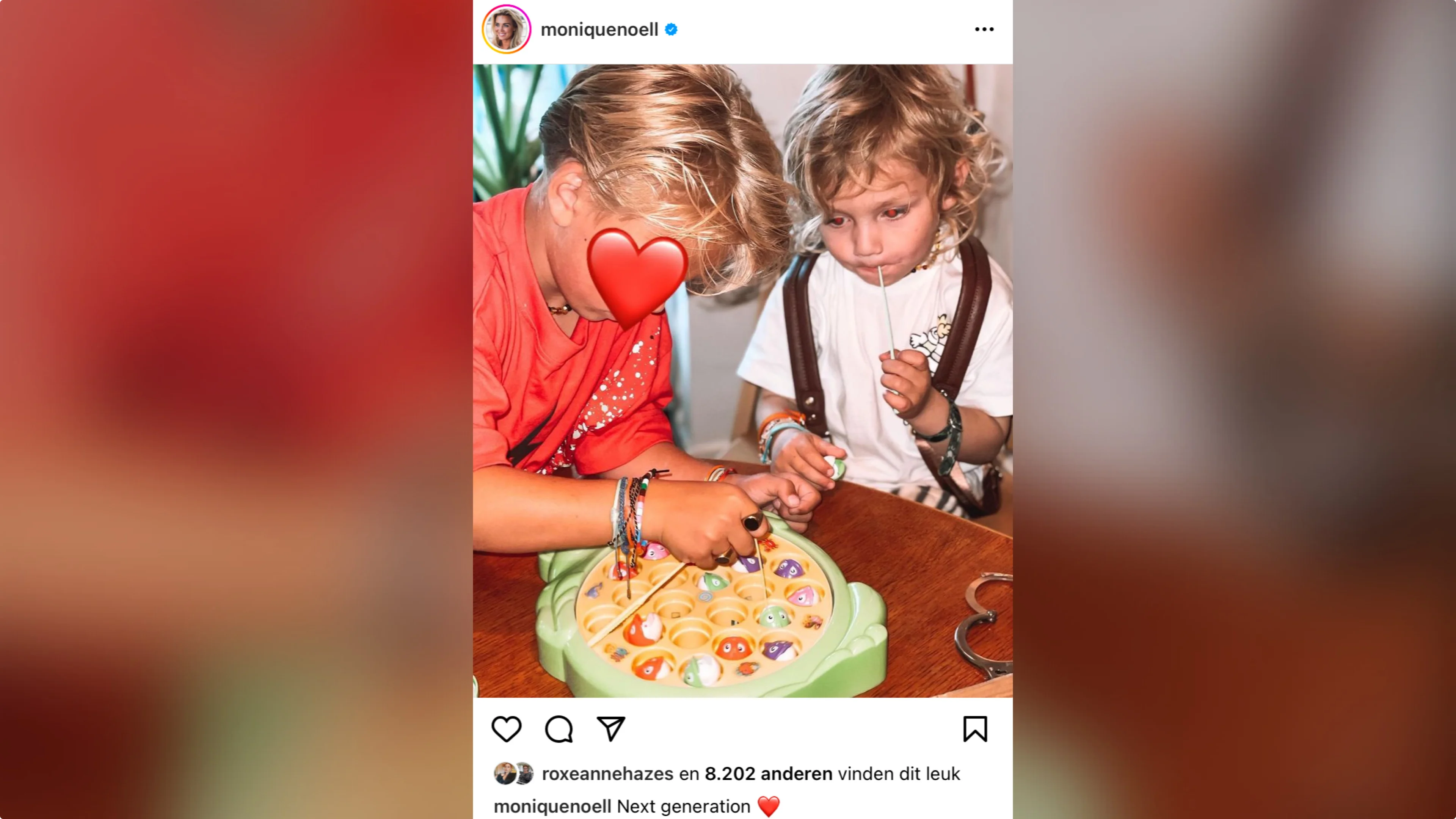 Op de foto is te zien hoe André jr. en Fender met elkaar een spelletje aan het spelen zijn. "Volgende generatie", schrijft Monique er met een hartje bij.