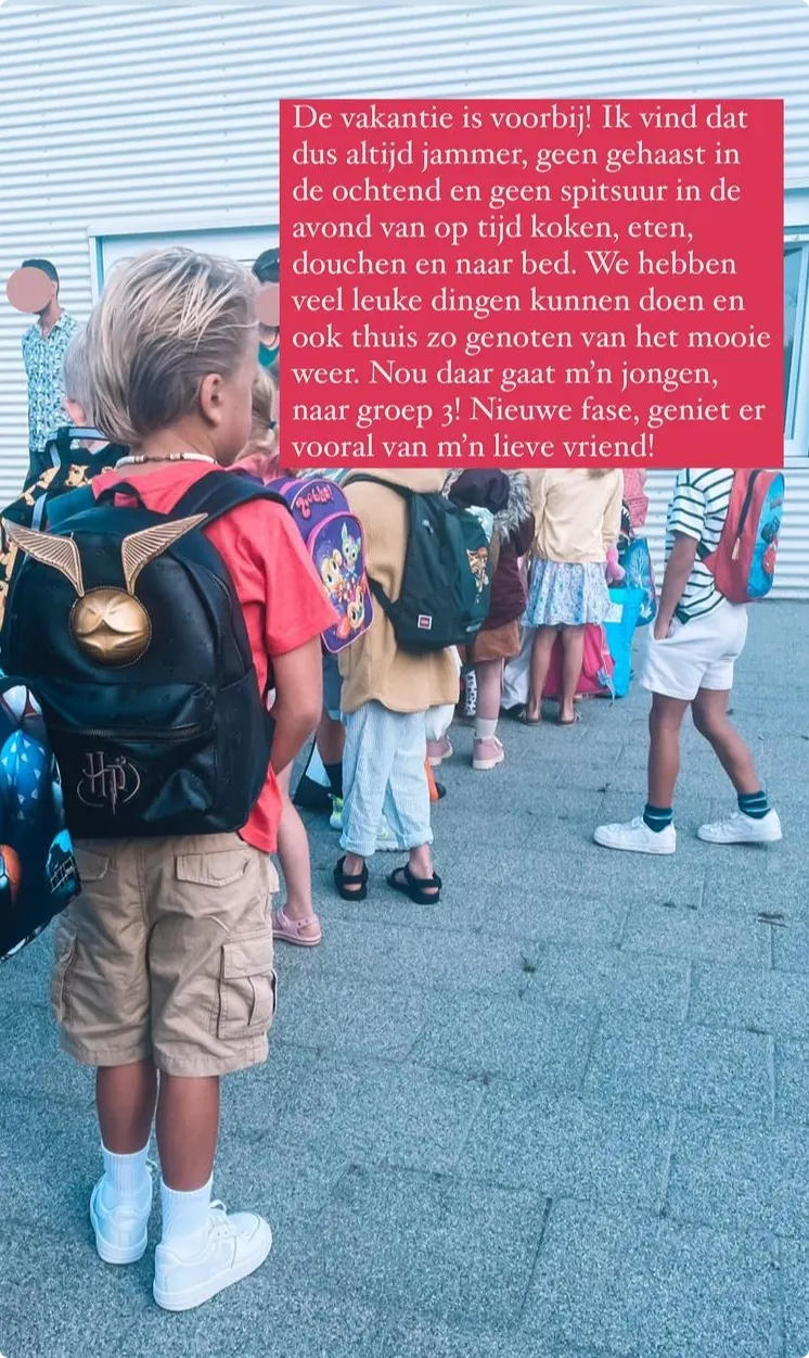 Zo schrijft ze in haar Instagram Stories onder meer dat ze het jammer vindt dat de zomervakantie al weer voorbij is en dat ze heel veel leuke dingen samen hebben gedaan. En ook: "Nou, daar gaat m'n jongen, naar groep 3! Nieuwe fase, geniet er vooral van m'n lieve vriend!"