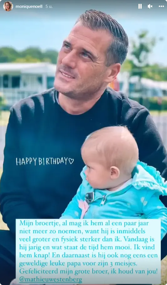 Monique Westenberg is apetrots op haar broer Mathieu. Ze draagt een Instagram Story op aan haar familielid op zijn verjaardag...