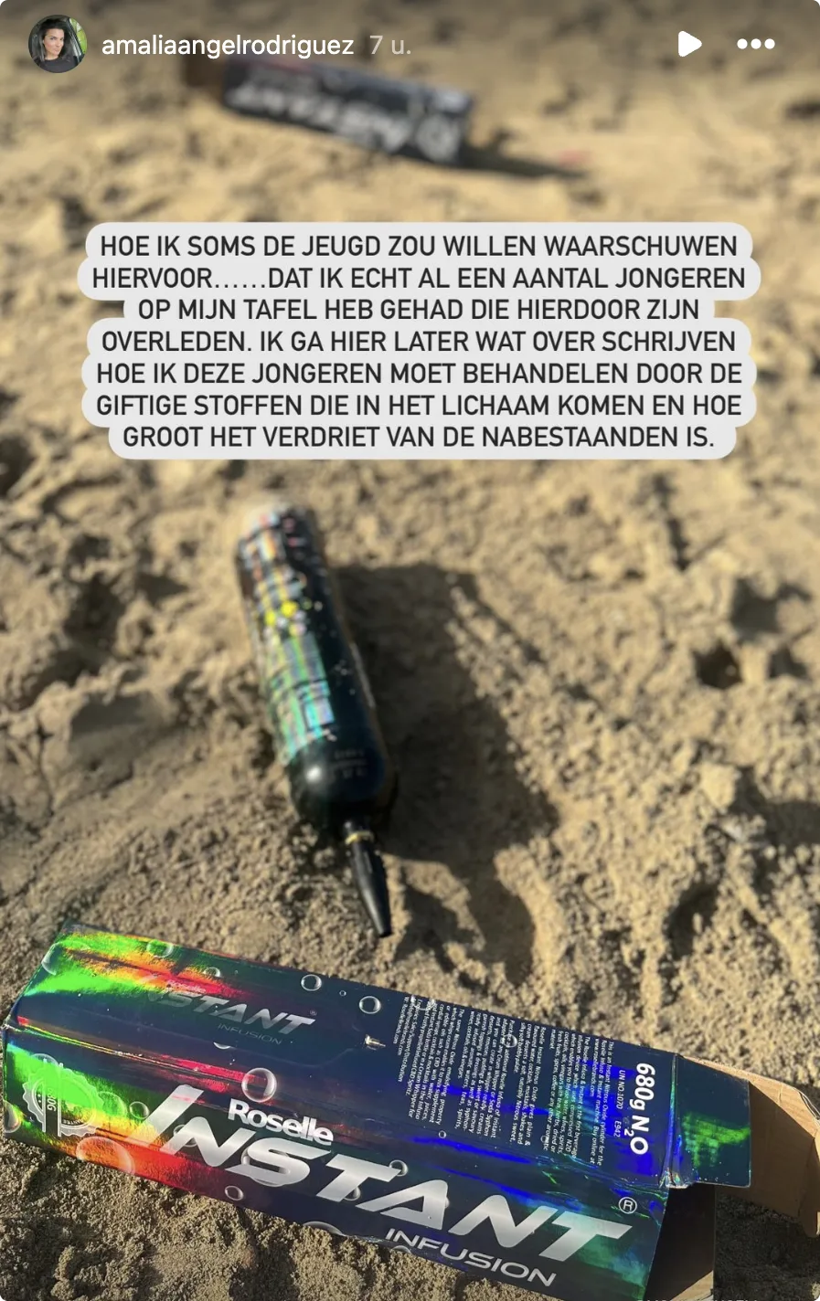 Amalia deelt dinsdag in haar Instagram Stories een foto van een gebruikt busje lachgas dat is achtergelaten op het strand. "Hoe ik soms de jeugd zou willen waarschuwen hiervoor… Dat ik echt al een aantal jongeren op mijn tafel heb gehad die hierdoor zijn overleden”, zo schrijft ze erbij.