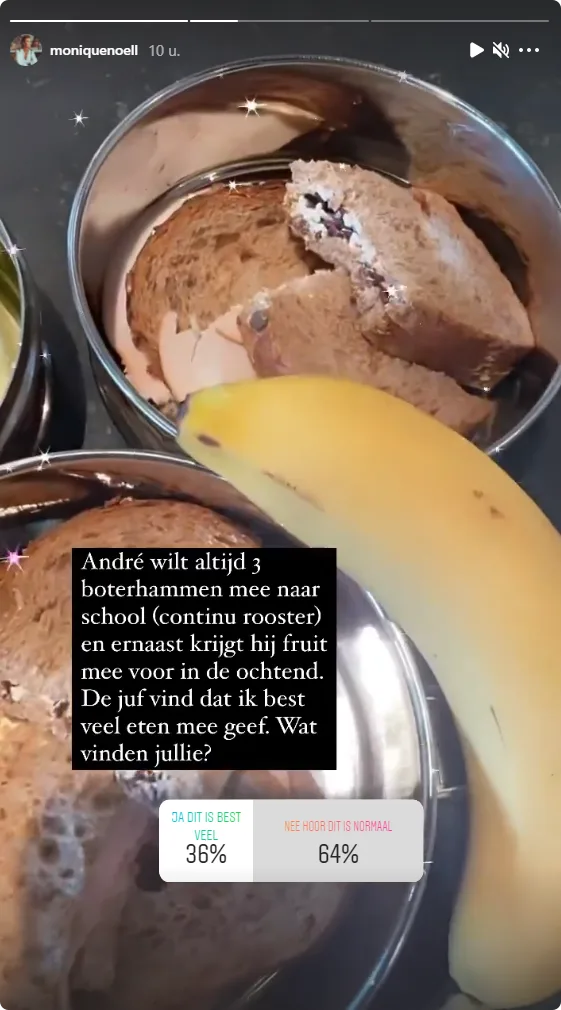 Monique vraag op Instagram haar volgers om hulp bij een dilemma. Ze schrijft: "André wilt altijd 3 boterhammen mee naar school (continu rooster) en ernaast krijgt hij fruit mee voor in de ochtend." Ze vraagt vervolgens op haar stories of mensen dit te veel vinden.