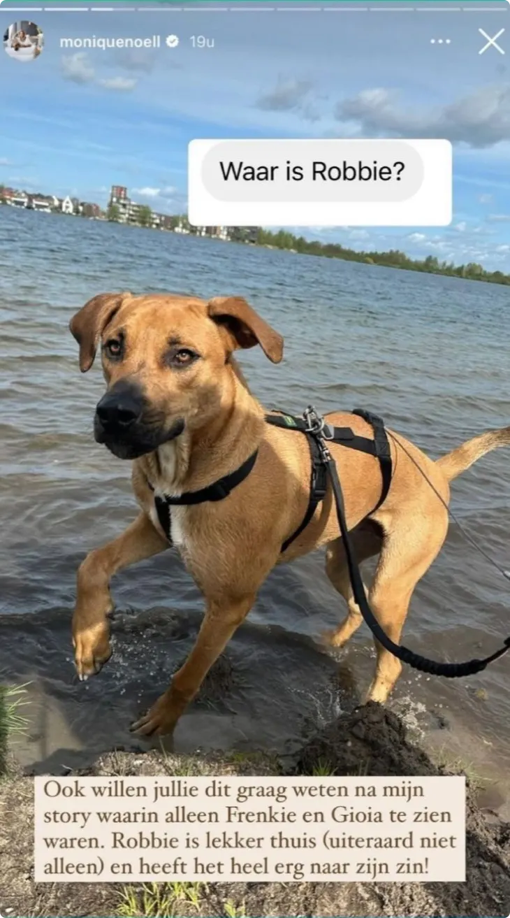 Gelukkig reageerde Monique op haar Instagram het volgende: "Ook willen jullie dit graag weten na mijn story waarin alleen Frenkie en Gioia te zien waren. Robbie is lekker thuis (uiteraard niet alleen) en heeft het heel erg naar zijn zin!", schrijft ze.