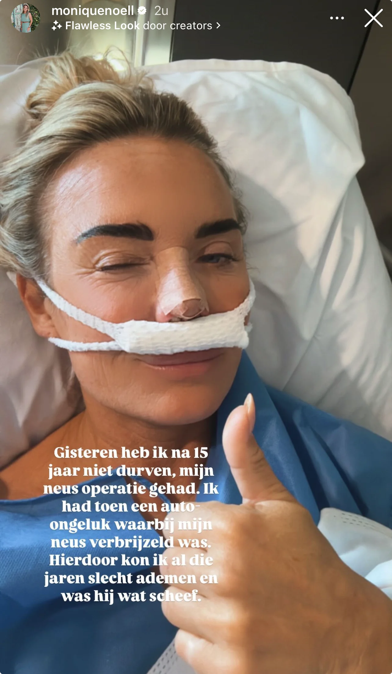 "Gisteren heb ik na 15 jaar niet durven, mijn neusoperatie gehad. Ik had toen een auto-ongeluk waarbij mijn neus verbrijzeld was. Hierdoor kon ik al die jaren slecht ademen en was hij wat scheef", schrijft Monique bij een foto waarop haar neus in het verband zit.