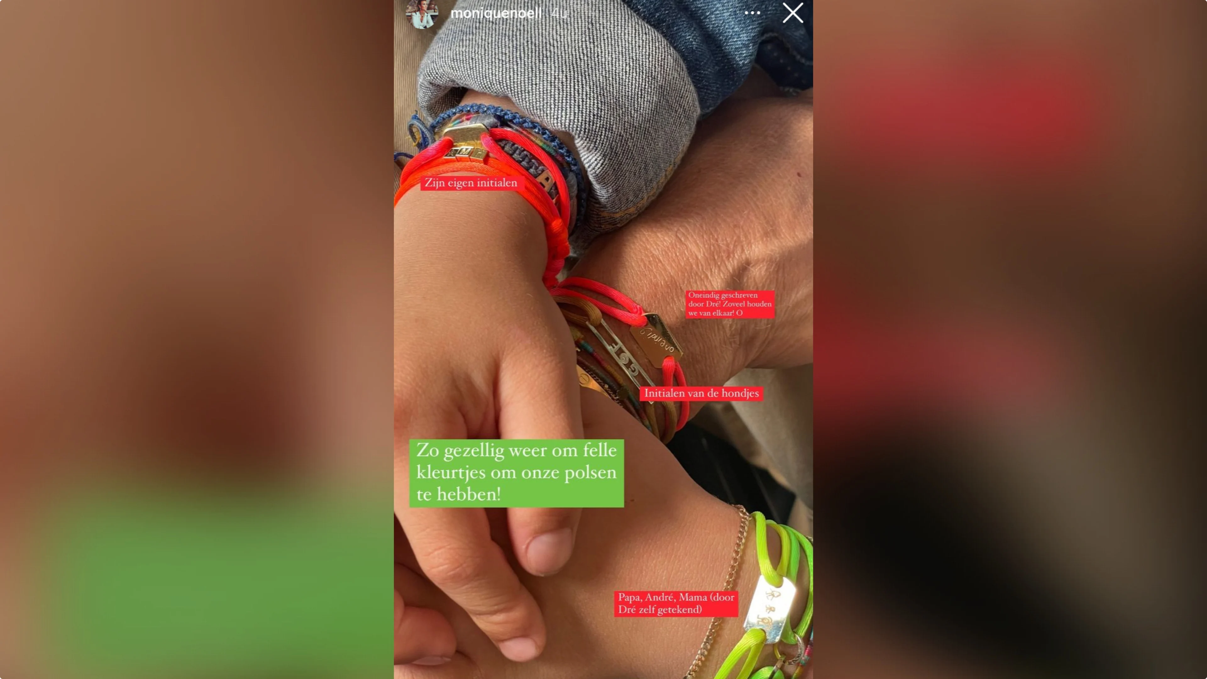 Ze heeft een paar kleurrijke armbandjes laten graferen. Op die van Monique staan de initialen van haar hondjes en het woord 'oneindig'. "Zoveel houden we van elkaar!"