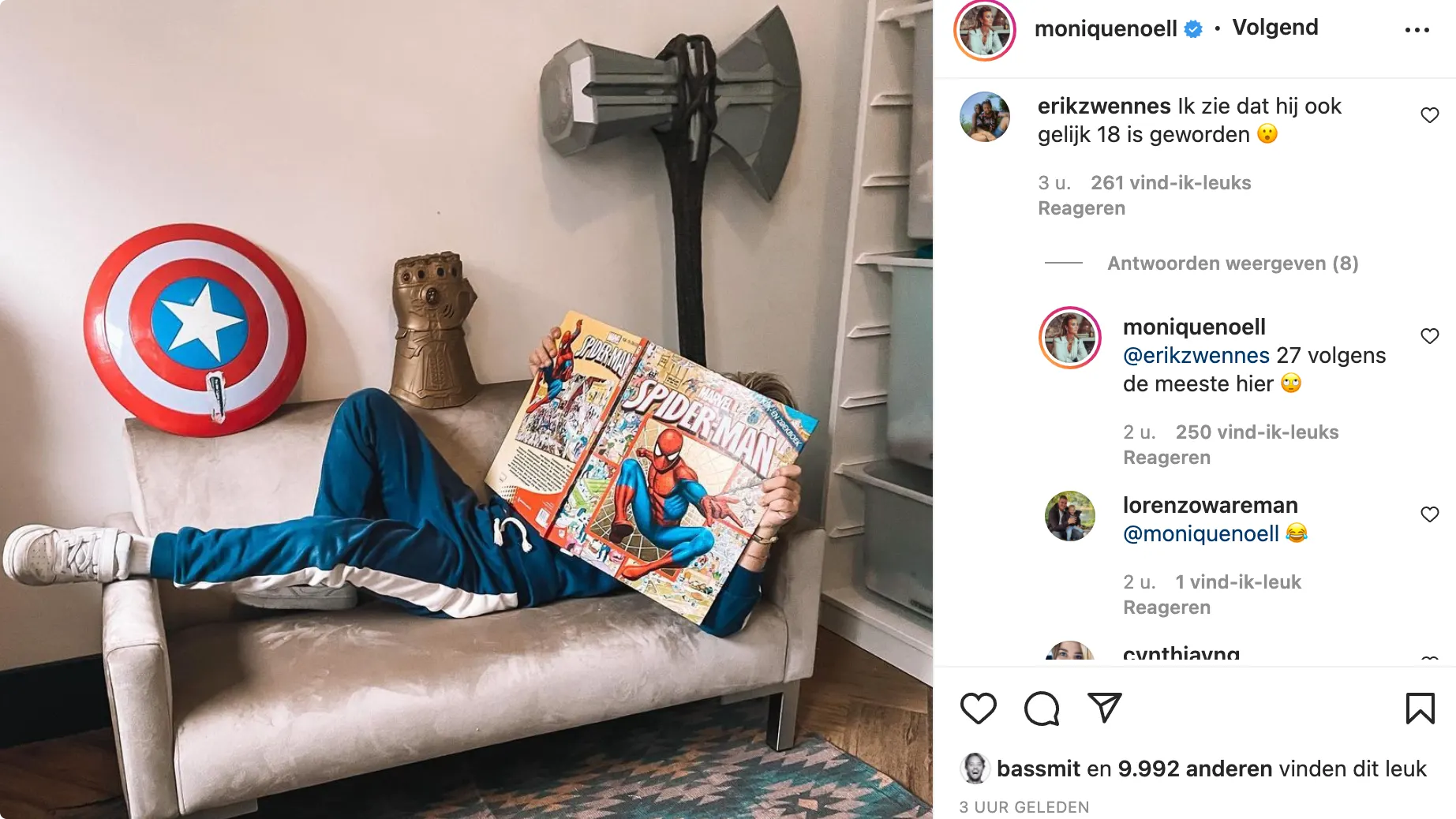 Op Instagram deelt ze onderstaande post waarop haar zoontje is te zien. Zo schrijft ze: "Mijn kleine Avenger! Hij wilde graag een eigen bankje in zijn kamer waar hij lekker op kan “chillen” (zijn woorden). Daar ligt hij dan op zijn eigen bankje (...) En natuurlijk mama’s zelf ontworpen kleedje eronder!"