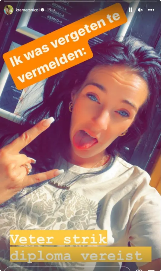 In haar Instagram Stories laat ze weten: "Ik ben nog altijd happy single allemaal... Wie meldt zich aan?!" Maar ze stelt wel een voorwaarde aan haar toekomstige partner: hij moet een veterstrikdiploma hebben... Hieronder zijn haar Stories te zien: