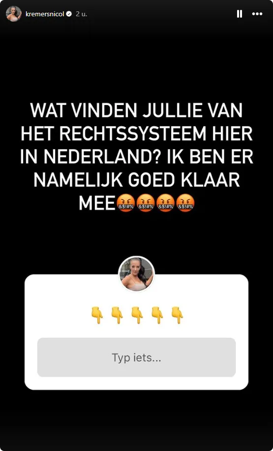 "Wat vinden jullie van het rechtssysteem hier in Nederland? Ik ben er namelijk goed klaar mee", schrijft Nicol op Instagram met boze emojis. Daarna plaatst de ex van Peter Gillis een aantal reacties van haar volgers. "Dat ze mooi de tering krijgen", schrijft iemand, Nicol is het zo te zien hier mee eens want ze plaatst allemaal uitroeptekens.