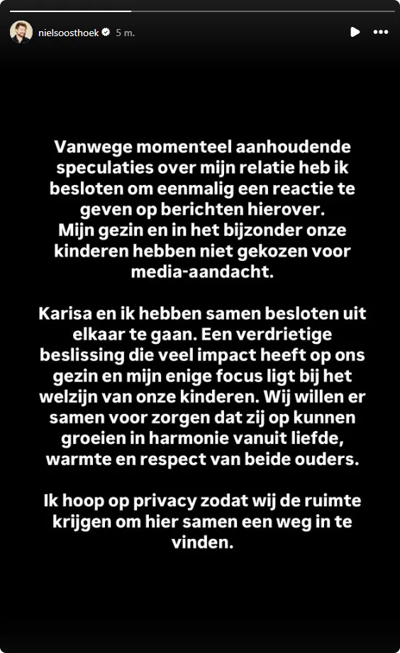 Niels (onder andere bekend als winnaar van De Verraders Halloween 2024, zie video) geeft in zijn Instagram Story eenmalig duidelijkheid. Zo schrijft hij: "Karisa en ik hebben samen besloten uit elkaar te gaan. Een verdrietige beslissing die veel impact heeft op ons gezin en mijn enige focus ligt bij het welzijn van onze kinderen."