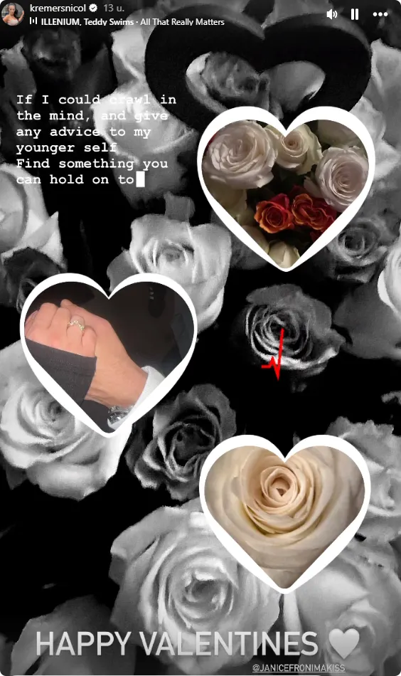 Nicol is flink in het zonnetje gezet op Valentijnsdag, ze deelt een foto van een grote bos rozen én een ring. "Happy Valentines", schrijft ze eronder. Ook tagt ze haar nieuwe partner, die Janice heet en model is. Tekst gaat verder onder de foto.