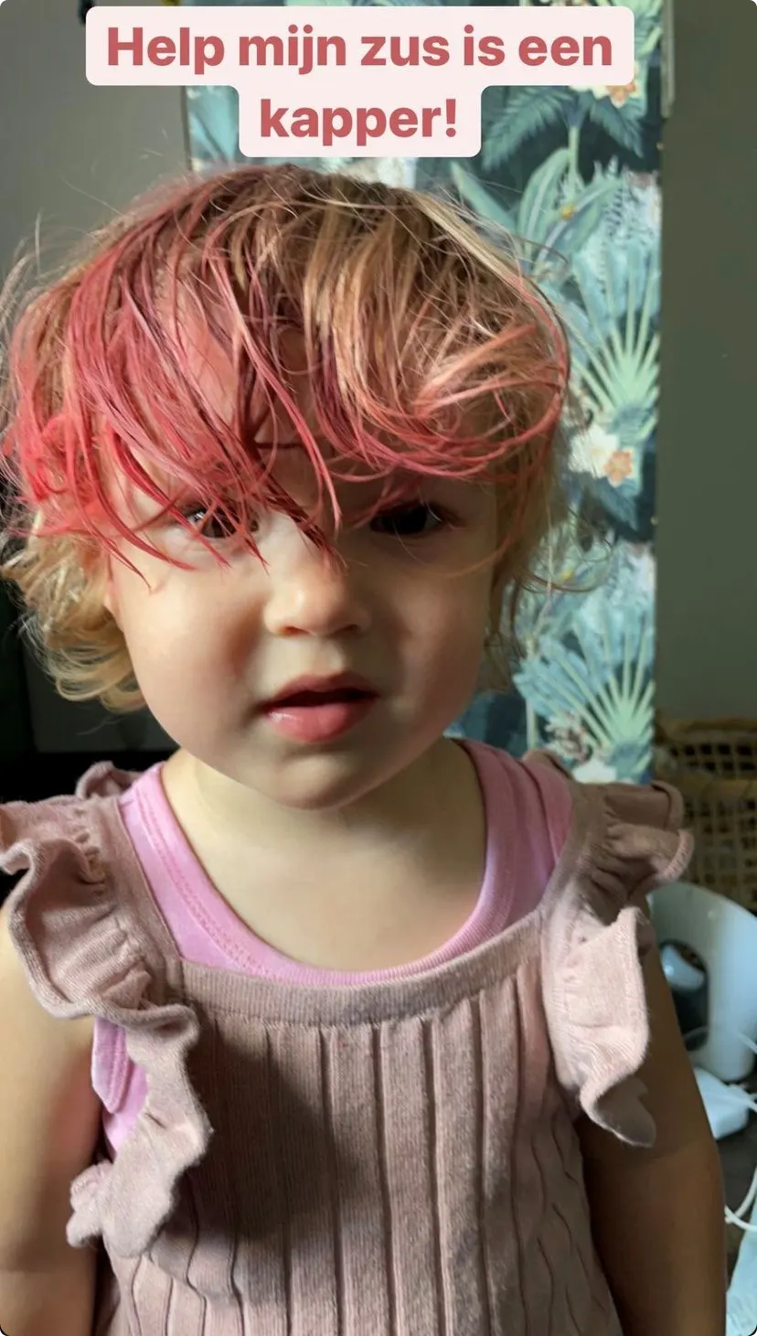 Katja laat weten dat haar oudste dochter Sammie het haar van Coco Loulou deels rood heeft geverfd. ''Help mijn zus is een kapper'', aldus Schuurman bij de foto hieronder.