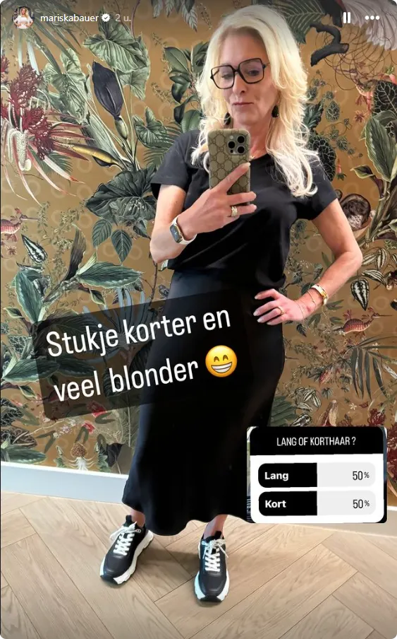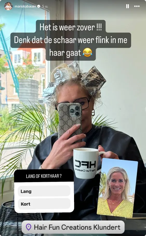 "Het is weer zover! Ik denk dat de schaar weer flink in mijn haar gaat", schrijft Mariska bij een selfie. Op de foto zit de de blondine in de kappersstoel, ze vraagt aan haar volgers om te stemmen op lang of kort haar. Daarna plaatst ze weer een selfie met het eindresultaat: "Stukje korter en veel blonder".