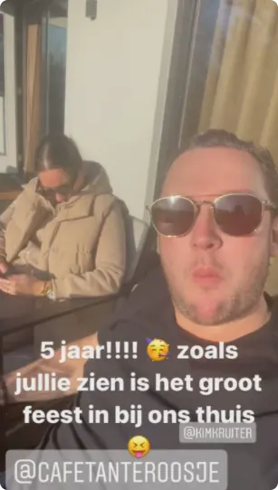 Op social media viert hij met zijn grote liefde Kimberly dat ze alweer vijf jaar geleden bij het Amsterdamse café Tante Roosje begon. Hieronder zie je een screenshot uit dat fragment, waarin zijn ogenschijnlijke nieuwe look te zien is.