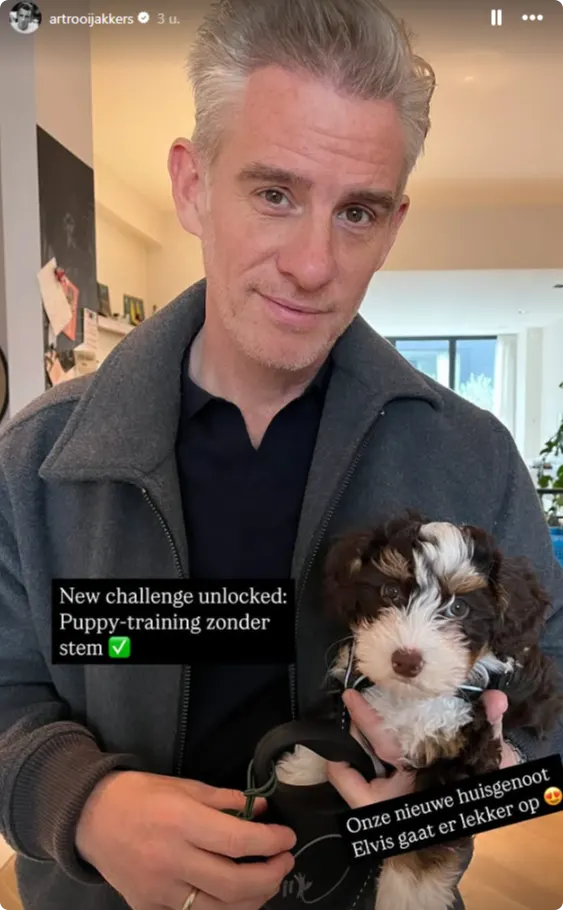 De presentator en zijn vrouw Karlijn hebben er een nieuw gezinslid bij: een puppy. Op Instagram laat hij weten: "Nieuwe uitdaging ontgrendeld: puppytraining zonder stem. Onze nieuwe huisgenoot Elvis gaat er lekker op."