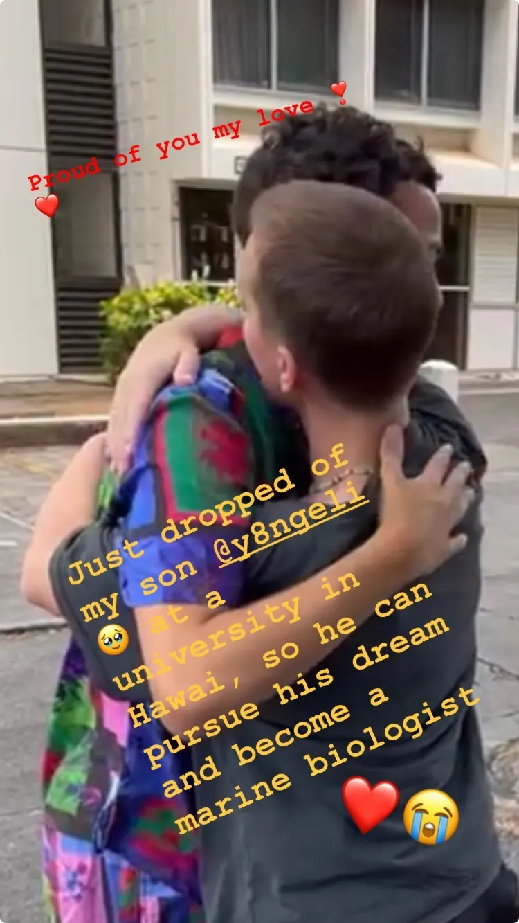 "Zojuist mijn zoon Elijah afgezet bij de Universiteit in Hawaii", schrijft Anouk op haar Instagram Story. "Nu kan hij zijn droom najagen en een marine bioloog worden."
