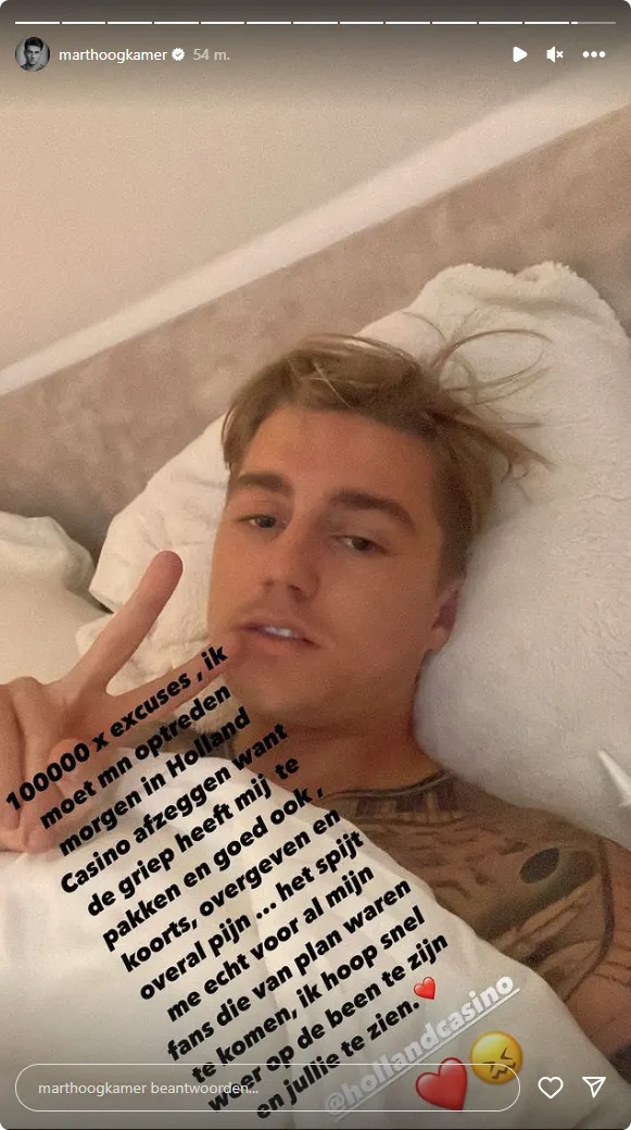 "100000 x excuses, ik moet m'n optreden morgen in Holland Casino afzeggen want de griep heeft mij te pakken en goed ook, koorts, overgeven en overal pijn", aldus Mart in zijn Instagram Stories. "Het spijt me echt voor al mijn fans die van plan waren te komen, ik hoop snel weer op de benen te zijn en jullie te zien."
