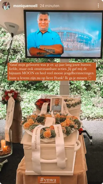 "Jij gaf mij de bijnaam MOON en heel veel mooie jeugdherinneringen", vervolgt de verdrietige Monique. "Jouw 9 levens zijn nu op, lieve Frank. Ik ga je missen."