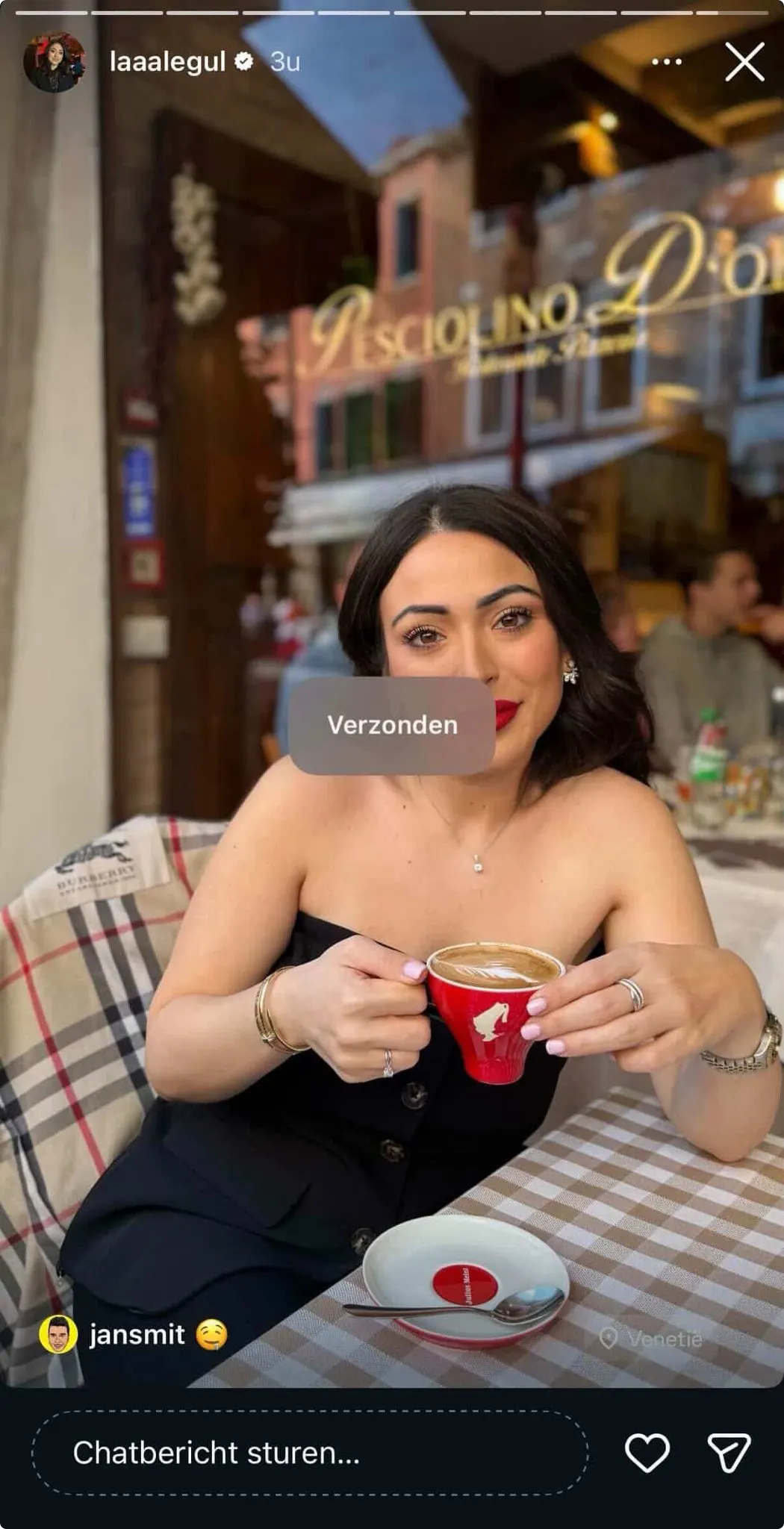 Een opvallende actie van Jan Smit. Onder een Instagram-bericht van columniste Lale Gül plaatste de zanger een opvallende emoticon: een kwijl-emoji. De schrijfster vertoeft momenteel in Venetië en poseert daar met een koffietje. Is het een vergissing van Jan, of is hij simpelweg groot fan van een goede koffie?