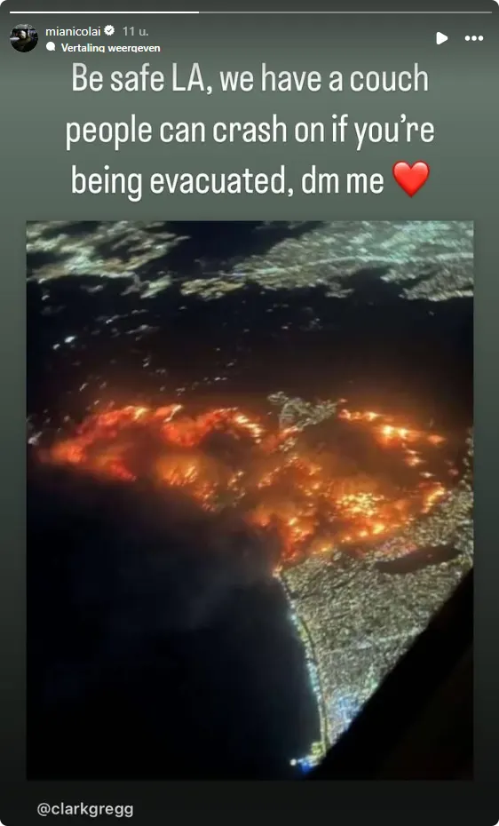 Oud-Eurovisie Songfestivaldeelnemer Mia Nicolai (zie video) biedt mensen die hun huis in Los Angeles door de brand moesten verlaten een slaapplek aan. Dit meldt zij via haar Instagram Stories.