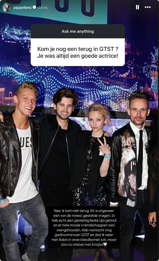 Pip deed onlangs een vragenrondje op Instagram en een vraag werd haar enorm vaak gesteld: kom je nog een keer terug in GTST? "Nee, ik kom niet meer terug", schreef de actrice haar antwoord. "Ik heb echt een geweldig leuke tijd gehad en er hele mooie vriendschappen aan overgehouden."
