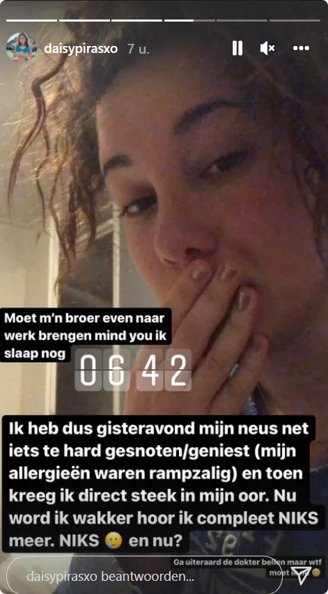 Dit vertelt de vriendin van Luca, de zoon van zanger Marco, op Instagram. "Moet m’n broer even naar werk brengen, mind you, ik slaap nog", verklaart ze haar onuitgeslapen look. "Ik heb dus gisteravond mijn neus net iets te hard gesnoten/geniest (mijn allergieën waren rampzalig). En toen kreeg ik direct steek in mijn oor."