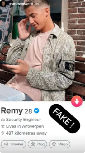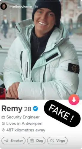 De Ik Ga Zwemmen-zanger deelt enkele voorbeelden van de nepperd. Er zijn meerdere foto's te zien van Mart op het account van 'Remy', een zogenaamde security engineer woonachtig in België. Volgens de app rookt de 28-jarige Remy en is hij gevaccineerd tegen het coronavirus.
