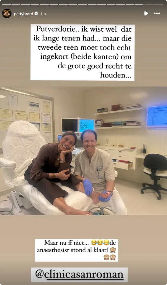 Patty Brard deelt vervelend nieuws op haar Instagram. Ze moet haar twee tweede tenen operatief laten inkorten (zie video). De reden is dat haar grote tenen anders scheef groeien, schrijft ze op Instagram. In 2021 had ze ook al een ingreep aan beide voeten.