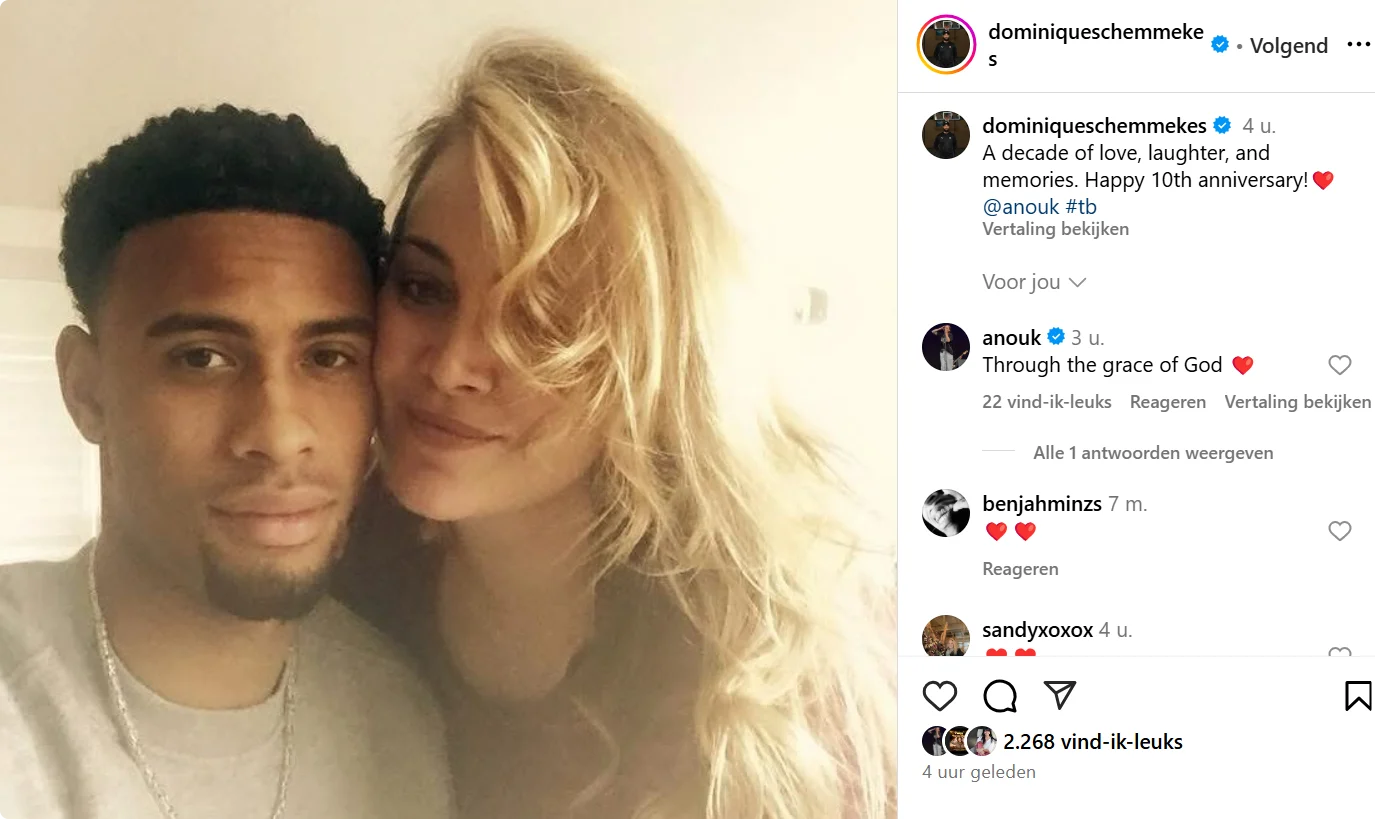 De smoorverliefde Dominique laat weten dat hij al tien jaar samen is met zijn vrouw Anouk. Dit doet hij door een kiekje te delen uit de oude doos. "Door de genade van God", reageert Anouk onder het bericht.