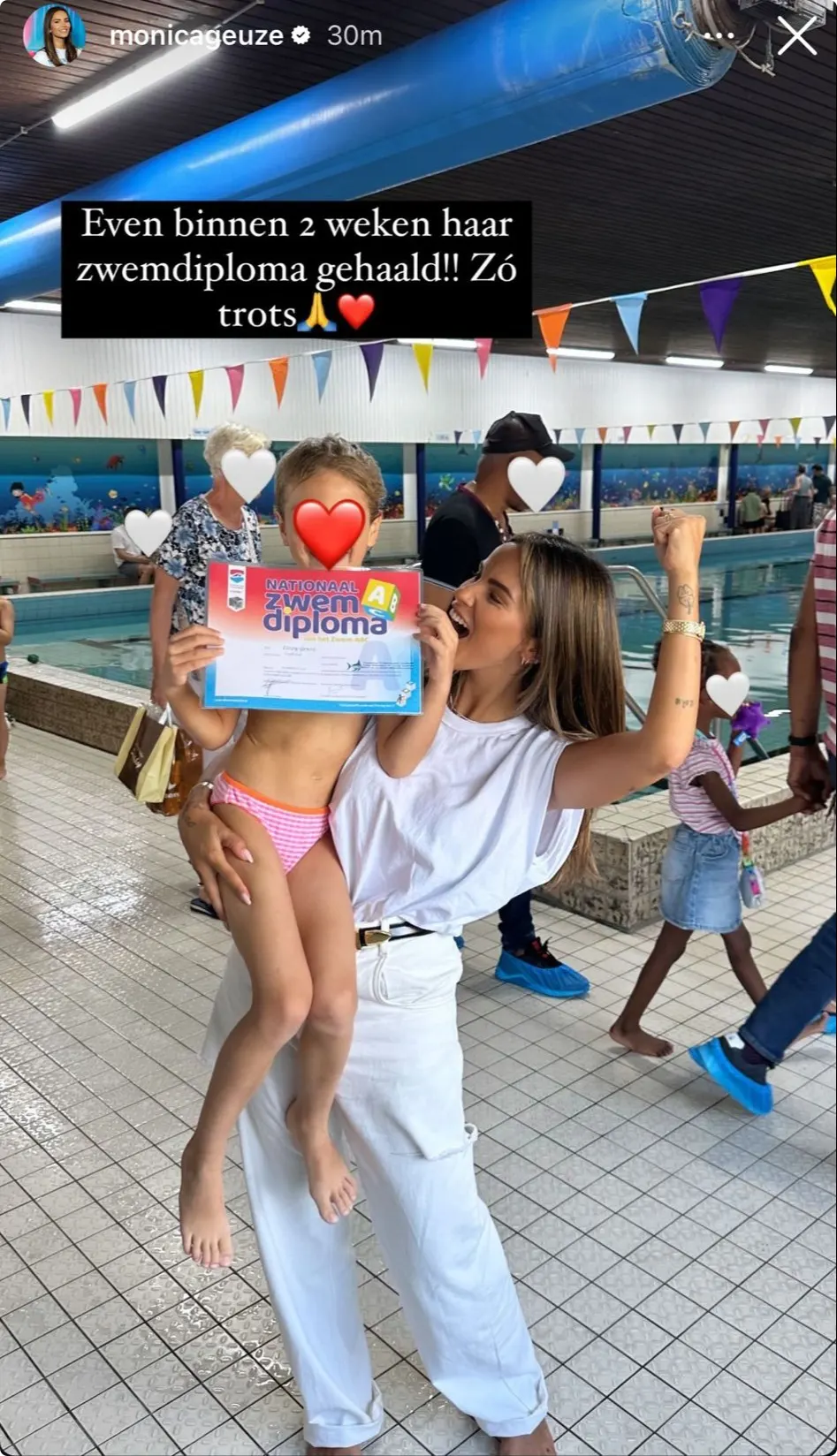 Monica deelt een foto bij het zwembad, waar zij juichend opstaat met Zara-Lizzy in haar armen die een wel heel bijzonder papiertje vasthoudt: ze heeft haar zwemdiploma A gehaald. "Even binnen twee weken haar zwemdiploma gehaald!! Zó trots", schrijft ze erbij.