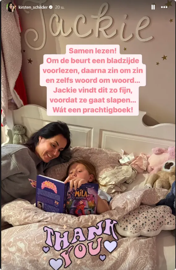 Dochter Jackie kreeg namelijk een prachtig boek opgestuurd. "Om dit weekend nóg leuker te maken! Er werd een heel bijzondere verrassing afgeleverd..." zegt Kirsten in haar eerste Instagram Story. "Samen lezen! Om de beurt een bladzijde voorlezen, daarna zin om zin en zelfs woord om woord... Jackie vind dit zo fijn, voordat ze gaat slapen. Wát een prachtig boek!"