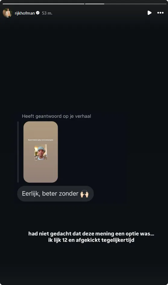 In zijn stories laat Rijk weten dat het "niet helemaal goed ging". Zo reageert hij op een compliment met: "Had niet gedacht dat deze mening een optie was... Ik lijk 12 en afgekickt tegelijkertijd."