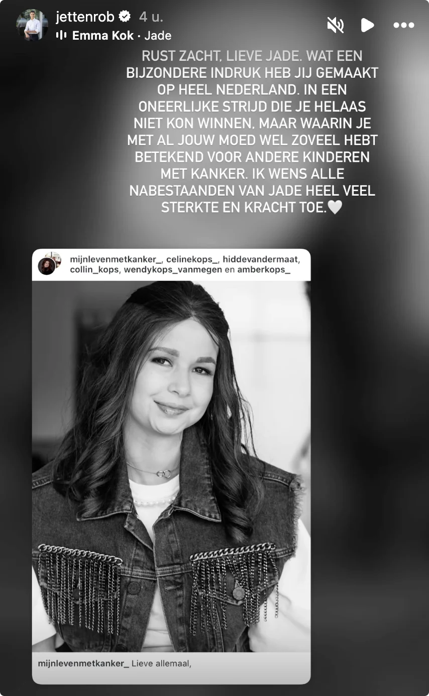 Op Instagram laat de premier zich uit over het verlies van Jade. "In een oneerlijke strijd die je helaas niet kon winnen. Maar waarin je met al jouw moed wel zoveel hebt betekend voor andere kinderen met kanker," schrijft Rob. Tot slot wenst hij de nabestaanden "ontzettend veel sterkte en kracht toe."