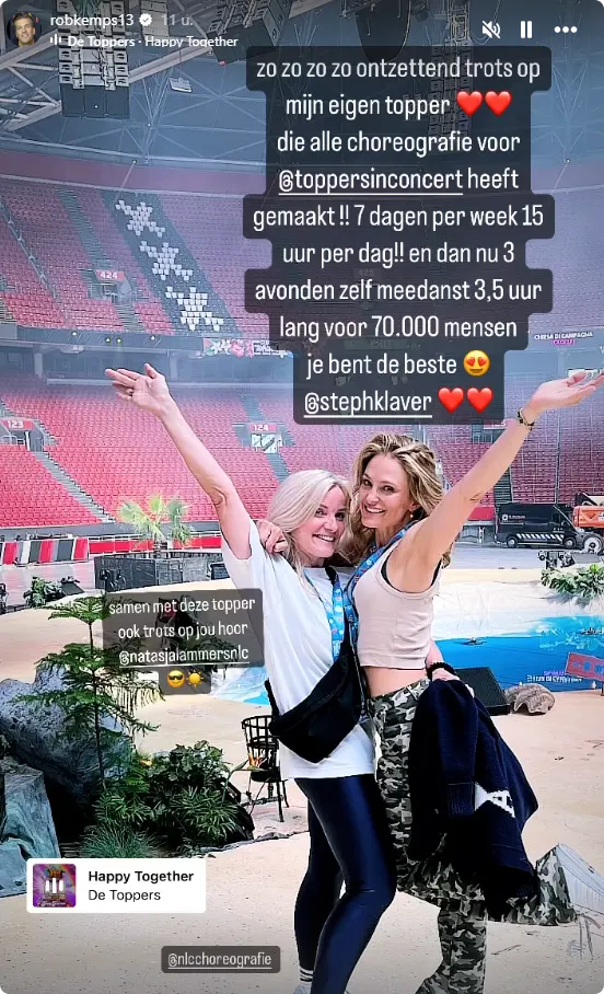 Stephanie heeft de choreografie voor de Toppers-concerten bedacht en daar is Rob heel trots op. "Zo zo zo zo ontzettend trots op mijn eigen topper", begint hij zijn verhaal op Instagram. "Zeven dagen per week, vijftien uur per dag en dan nu drie avonden zelf meegedanst! Drieënhalf uur lang voor 70.000 mensen, je bent de beste!"