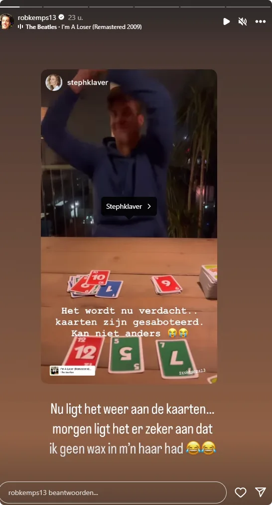 Zo plaatste Stephanie vrijdagavond een video van hun gameavond, waarbij Stephanie de verliezer is, op Instagram waarbij ze schrijft: "Het wordt nu verdacht... Kaarten zijn gesaboteerd kan niet anders". Volgens Rob zijn deze beschuldigingen absoluut niet terecht. Zo reageert hij op het Instagram-verhaal van zijn vriendin: "Nu ligt het weer aan de kaarten... Morgen ligt het er zeker aan dat ik geen wax in mijn haar had."