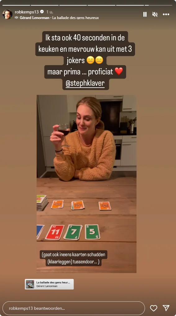 Zaterdagavond besluit het koppel opnieuw het spelletje Skip-Bo te gaan spelen. En wat Rob kan, kan ik ook moet Stephanie gedacht hebben. Want deze keer is Stephanie de winnaar van het spel. Zo plaatst deze keer Rob een video op Instagram waarbij hij schrijft: "Ik sta ook 40 seconden in de keuken en mevrouw kan uit met drie jokers... Maar prima, proficiat!" Ook schrijft hij tussenhaakjes: "Gaat ook ineens kaarten schudden / klaarleggen tussendoor."
