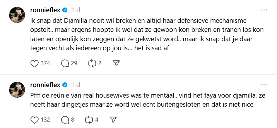 Dat schrijft Ronnie dit weekend op Threads, een soort Twitter van Instagram waar gebruikers korte updates kunnen achterlaten. Over de RHOAMS-reünie schrijft de rapper het volgende: "Pfff, de reünie van Real Housewives was te mentaal... Vind het faya ("erg", red.) voor Djamila. Ze heeft haar dingetjes, maar ze wordt wel echt buitengesloten en dat is niet nice."