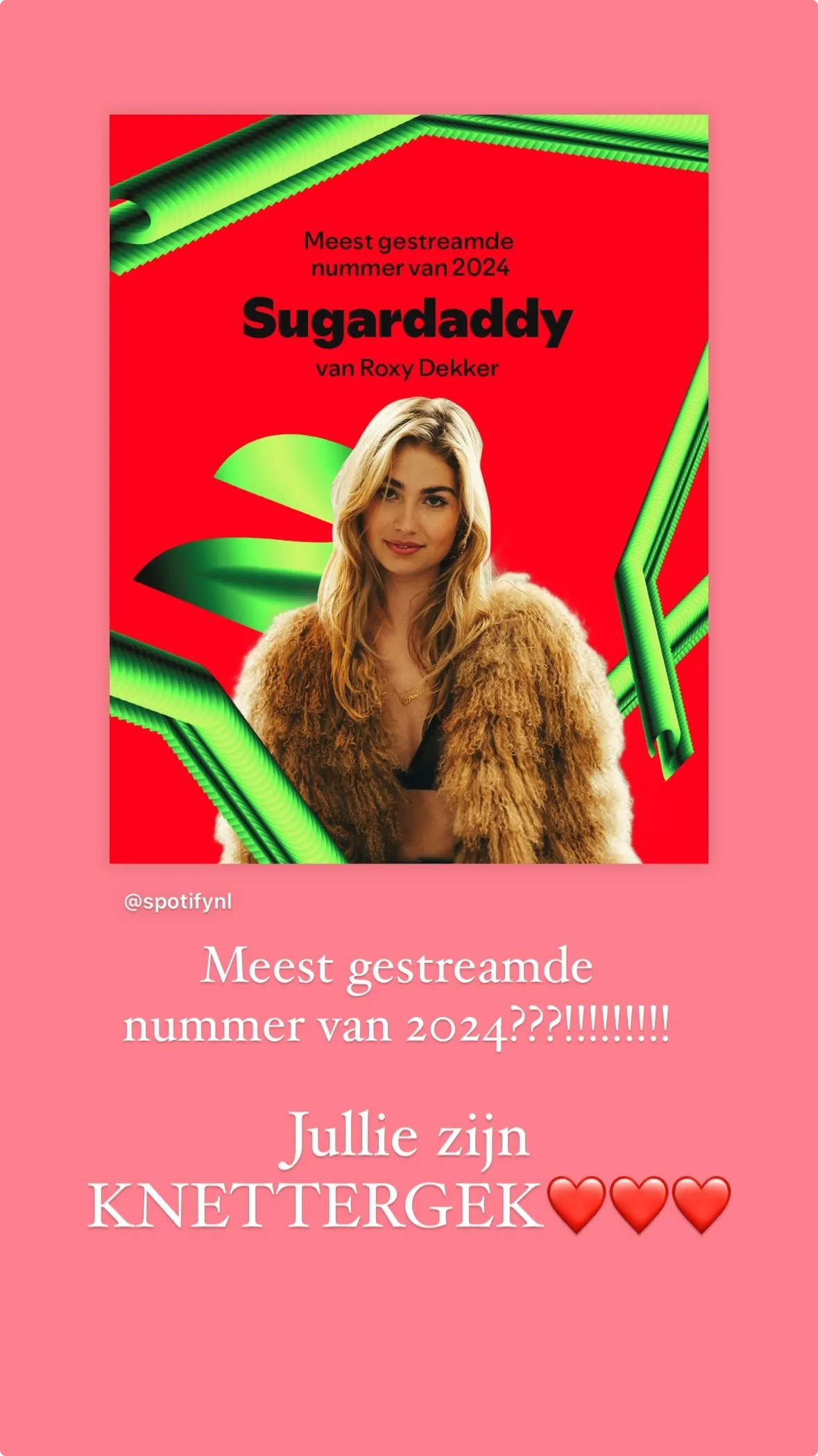 Roxy heeft dan wel het meest beluisterde liedje, maar als meest beluisterde artiest staat Taylor Swift met stip op één. De zangeres uit haar ongeloof op haar Instagram Story. "Meest gestreamde nummer van 2024?! Jullie zijn KNETTERGEK."