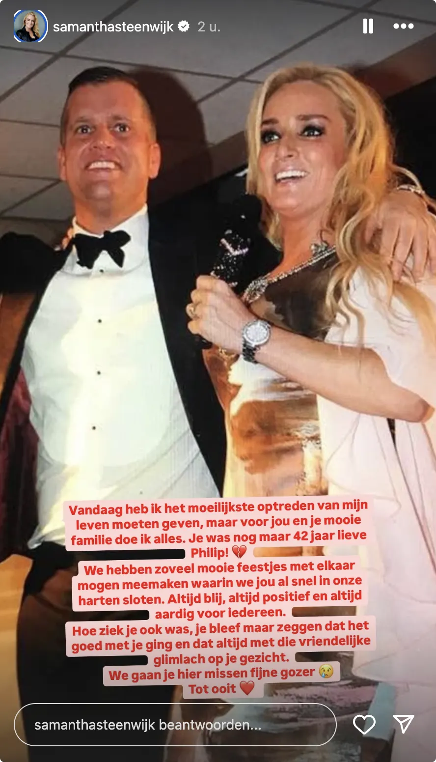 "Vandaag heb ik het moeilijkste optreden van mijn leven moeten geven, maar voor jou en je mooie familie doe ik alles", aldus Samantha in haar Instagram Stories. "Je was nog maar 42 jaar lieve Philip! We hebben zoveel mooie feestjes mogen meemaken waarin we jou al snel in onze harten sloten. Altijd blij, altijd positief en altijd aardig voor iedereen."