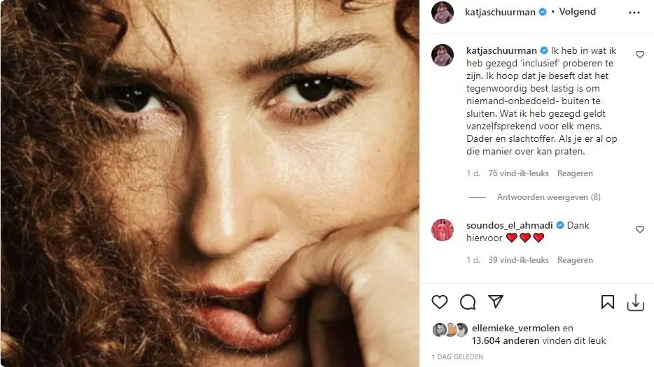 Katja kreeg na haar post al wat kritiek van haar volgers en reageerde: "Ik heb in wat ik heb gezegd ‘inclusief’ proberen te zijn. Ik hoop dat je beseft dat het tegenwoordig best lastig is om niemand-onbedoeld- buiten te sluiten. Wat ik heb gezegd geldt vanzelfsprekend voor elk mens. Dader en slachtoffer. Als je er al op die manier over kan praten."