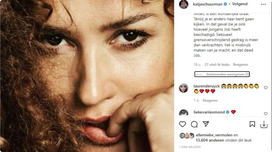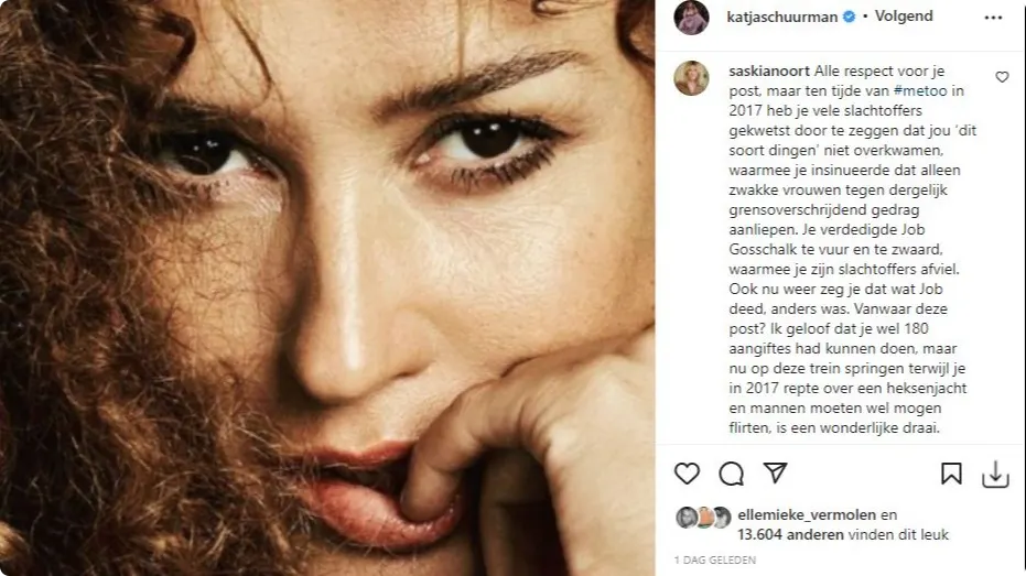 Saskia voelt zich genoodzaakt om te reageren op Katja's uitgebreide post en schrijft: "Alle respect voor je post, maar ten tijde van #metoo in 2017 heb je vele slachtoffers gekwetst door te zeggen dat jou ‘dit soort dingen’ niet overkwamen, waarmee je insinueerde dat alleen zwakke vrouwen tegen dergelijk grensoverschrijdend gedrag aanliepen. Je verdedigde Job Gosschalk te vuur en te zwaard, waarmee je zijn slachtoffers afviel. Ook nu weer zeg je dat wat Job deed, anders was. Vanwaar deze post?