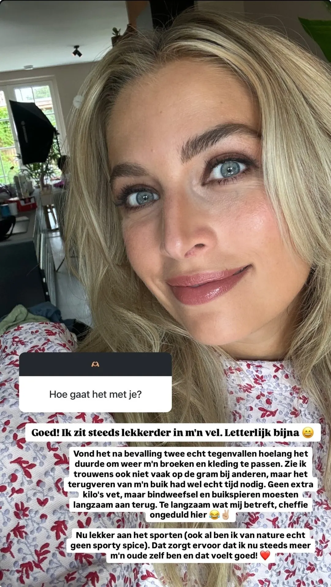 Daarna gaat ze wat specifieker in op het moederschap en vooral het herstel na haar zwangerschap, dat ondertussen al ruim een half jaar geleden is. "Vond het na bevalling twee echt tegenvallen hoelang het duurde om weer in m'n broeken en kleding te passen." Ze meent dat ze dit aspect van het zwangerschap ook niet vaak ziet terugkomen op sociale media, maar dat het terugveren van haar buik "echt tijd nodig had".